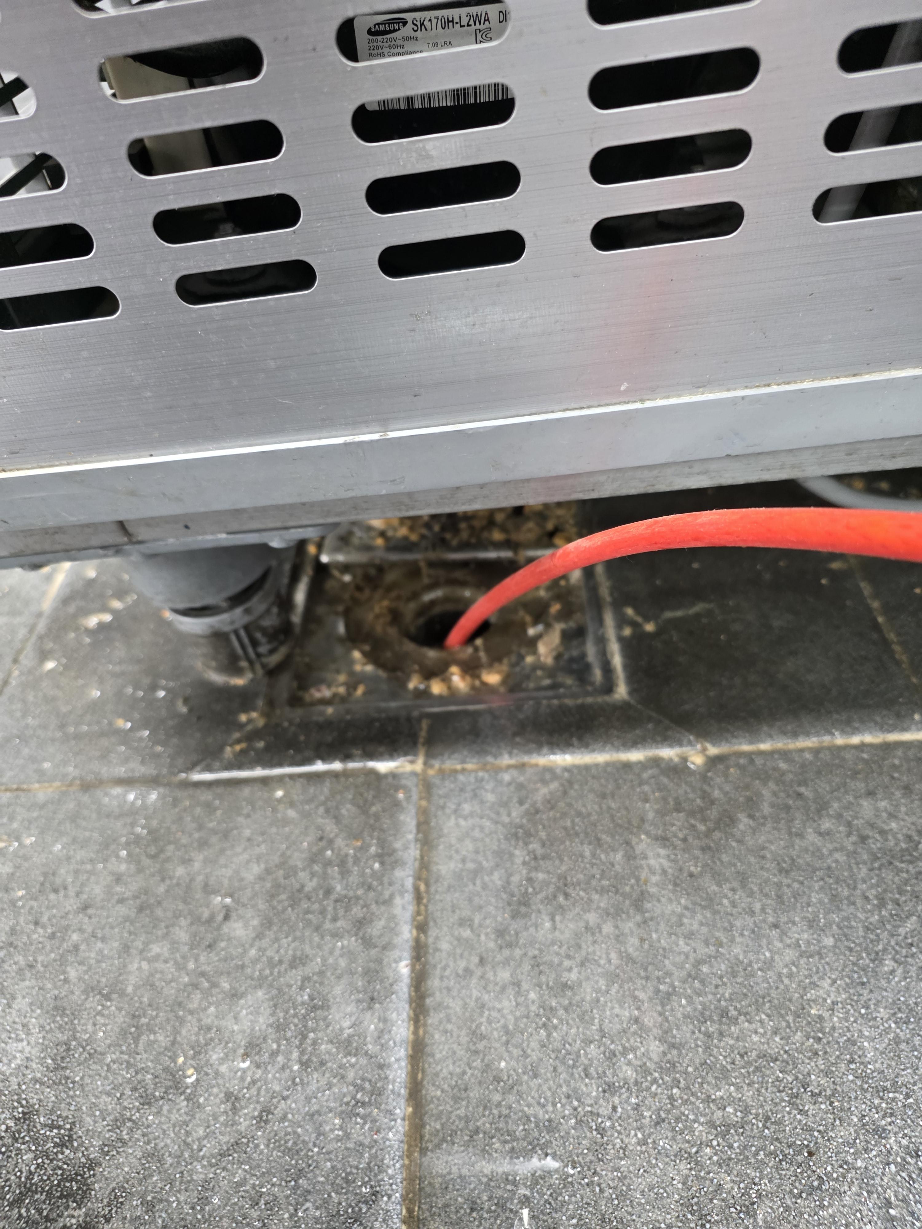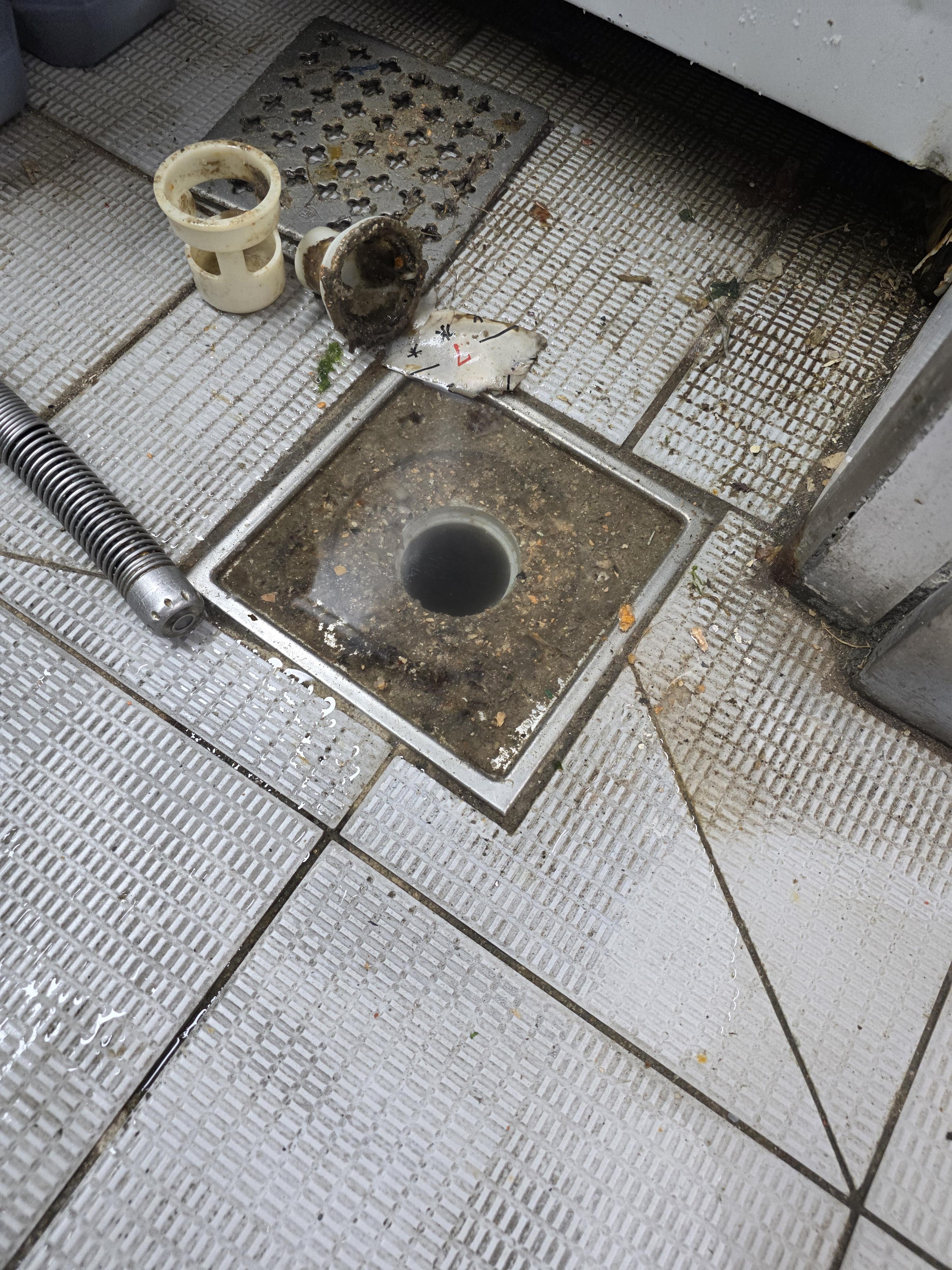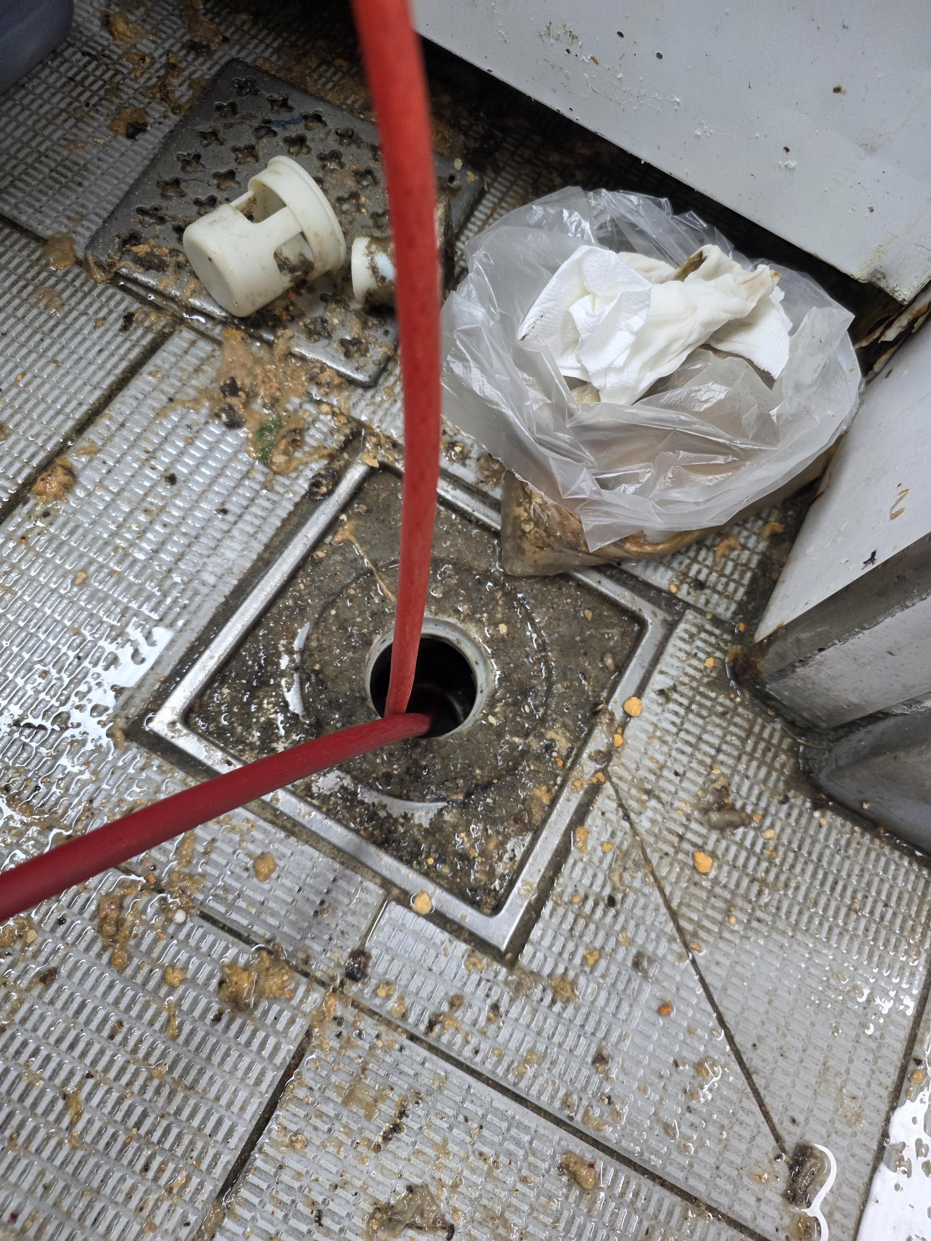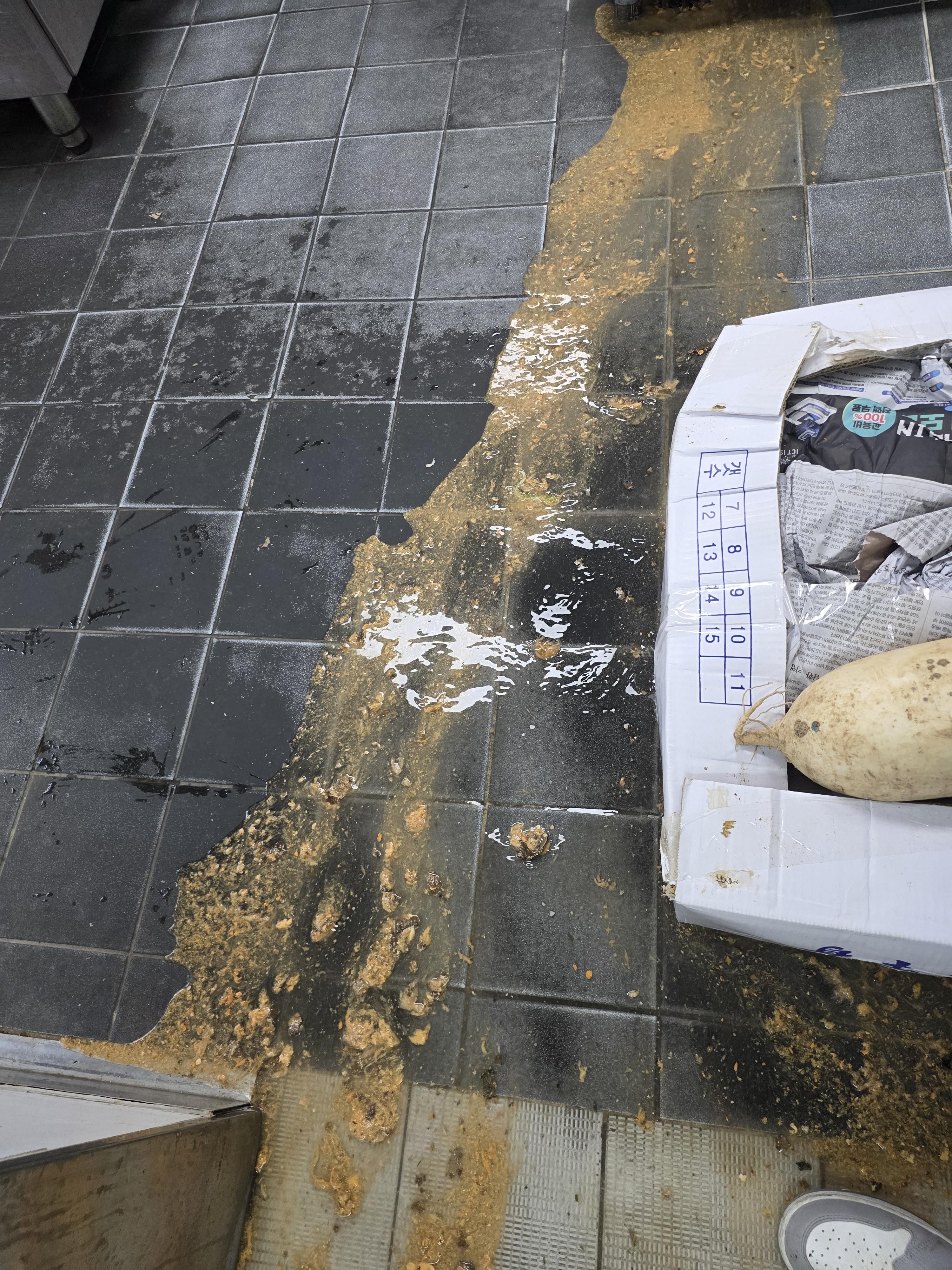 마트 반찬 코너 2곳에서 배수구가 막혀 물이 고이고 역류하는 문제가 생기자