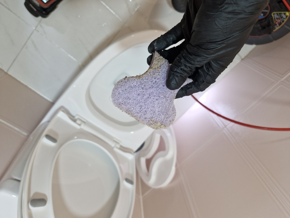 석션 장비를 사용하여 변기에 껴 있던 스폰지를 꺼내 제거해 주었으며